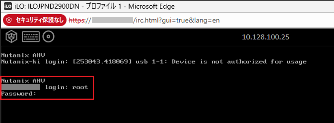 ベアメタルサーバーのコンソール画面が表示されたら、Nutanix AHVへrootユーザにてログインします。