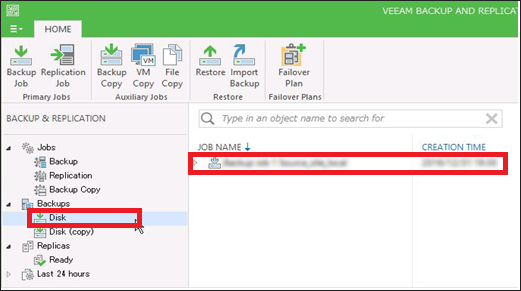 左ペインの「BACKUP & REPLICATION」→「Backups」「Disk」を選択すると、Veeamでバックアップした対象が表示されます。