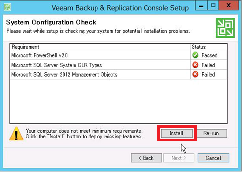 Veeamで使用するための機能が足りない場合、以下のようにfailedの表示が出ます。Installボタンをクリックしてインストールを実行します。