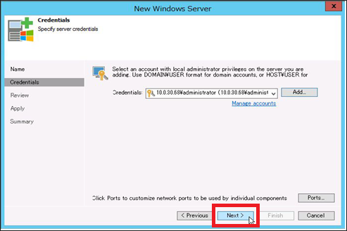 該当するサーバのAdministrator権限を持っているアカウントを登録します。「Add」をクリックします。