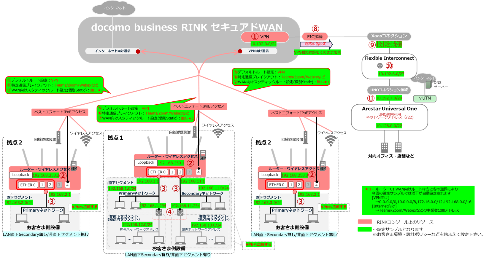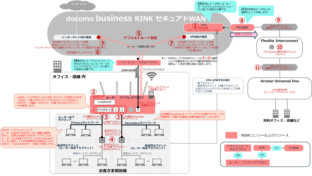 docomo business RINK セキュアドWAN 設計・設定で必要となる各アドレスは、本ページを参考にしてください。