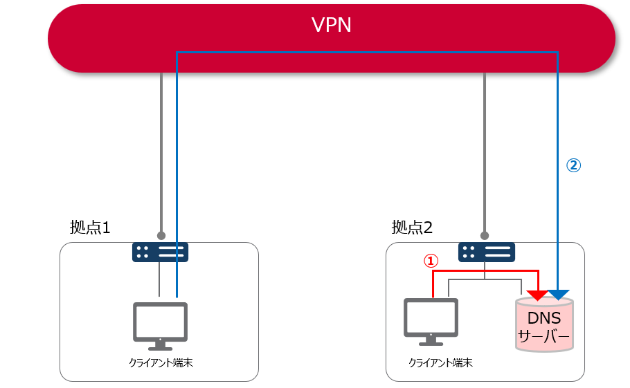 ①同じ拠点内のLAN側にクライアント端末とブレイクアウトDNSサーバーが存在している。