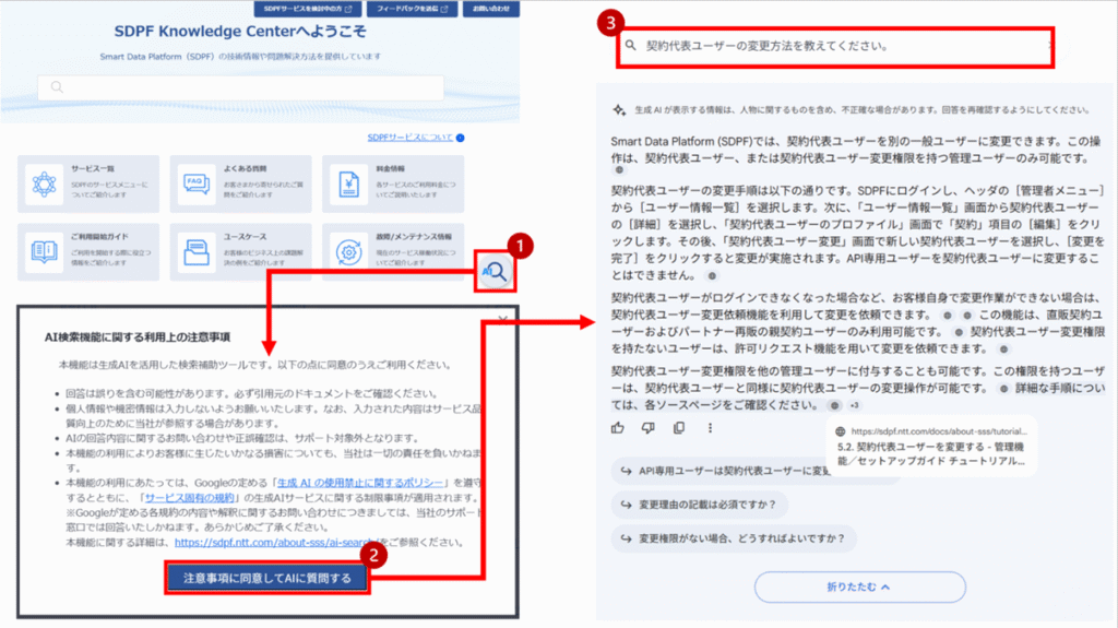 お客さまが知りたい内容を自然な文章(話し言葉など)で入力していただくと、AIがSDPF Knowledge Center内の関連ドキュメントを検索し、要約した回答と参照元のリンクを提示します。