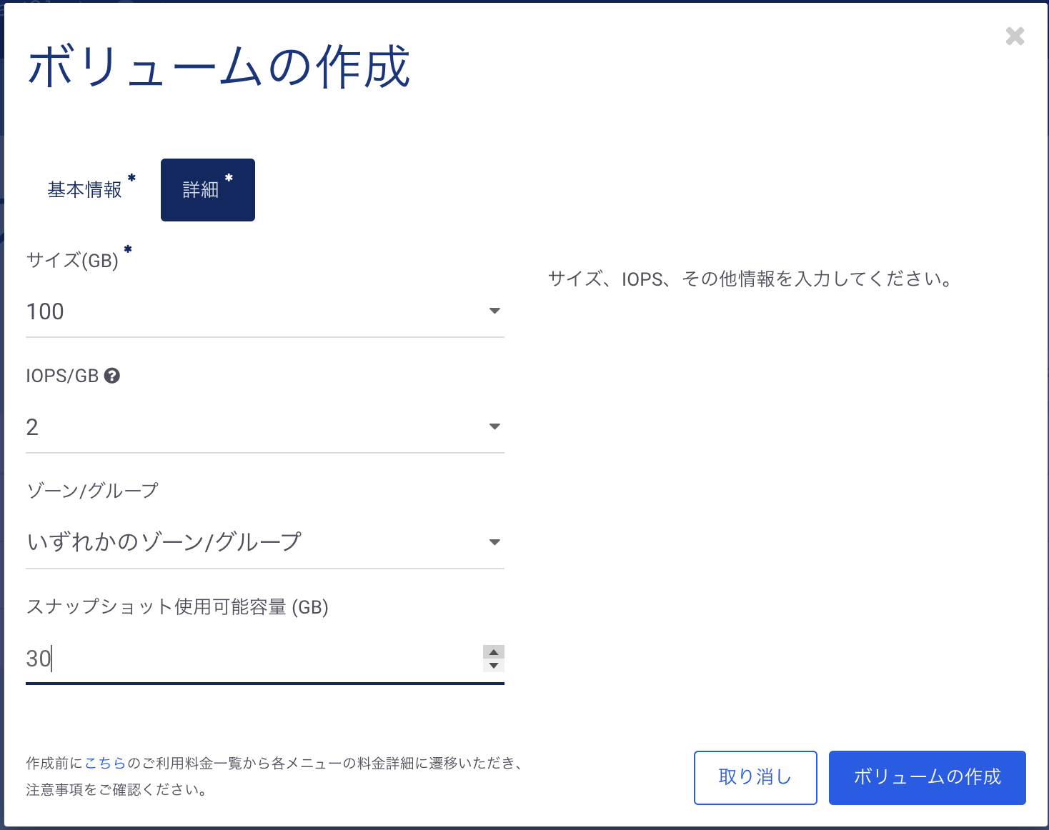 ボリュームの作成においては、下記の入力項目を設定する必要があります。