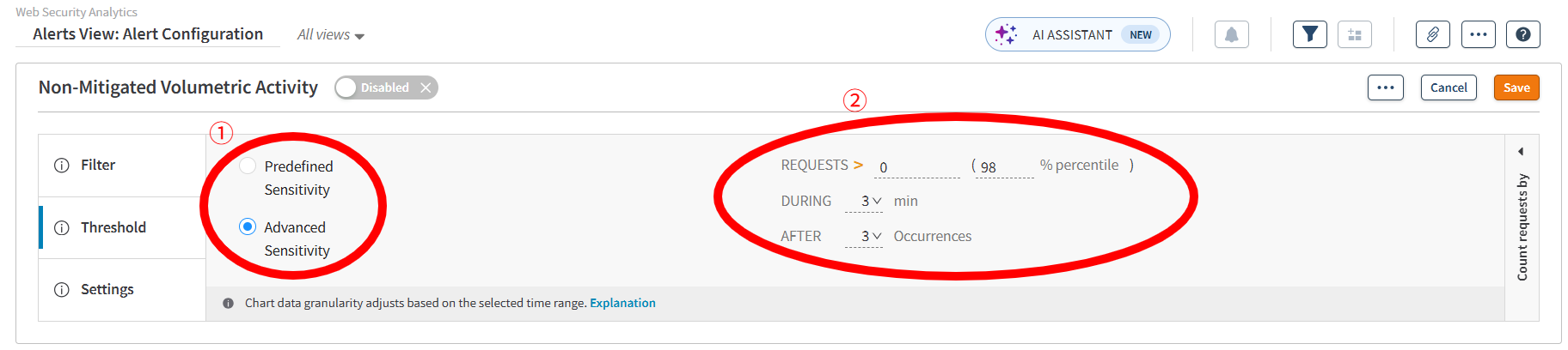 検知はしているが遮断されていない量的攻撃が疑われる事象が多量になった場合にアラートします。 |