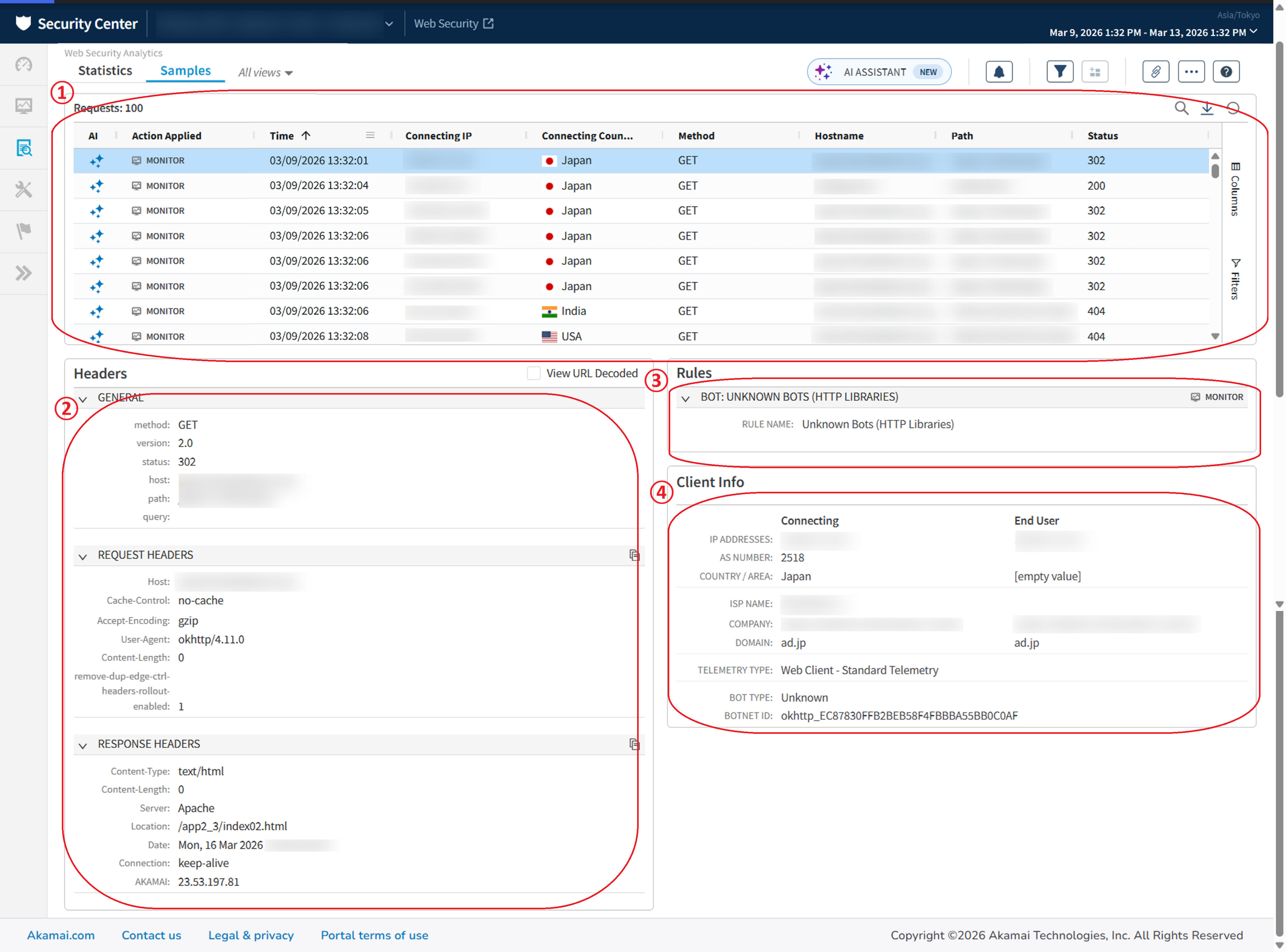 Web Security Analytics(WSA)のSamplesでは検知したトラフィックについてアクセス元のIPアドレスやヘッダなど検知した通信の詳細を確認することができます。