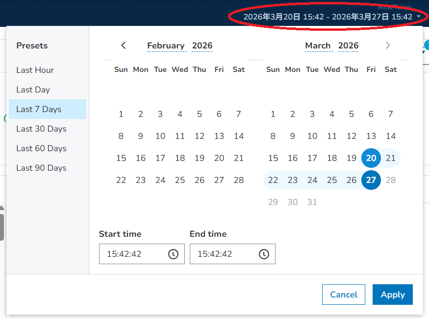 カレンダーから開始日・終了日及び開始時間・終了時間を選択して期間を指定する方法と、左のPresetsから過去1週間、1か月などを選択して指定する方法があります。
