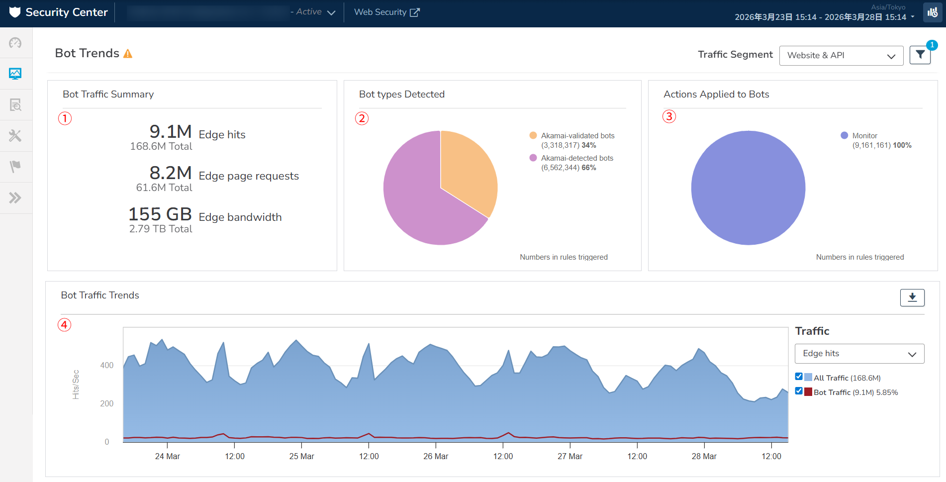 ボット対策のご契約がある場合、ボットのトラフィック検知状況について確認できます。
