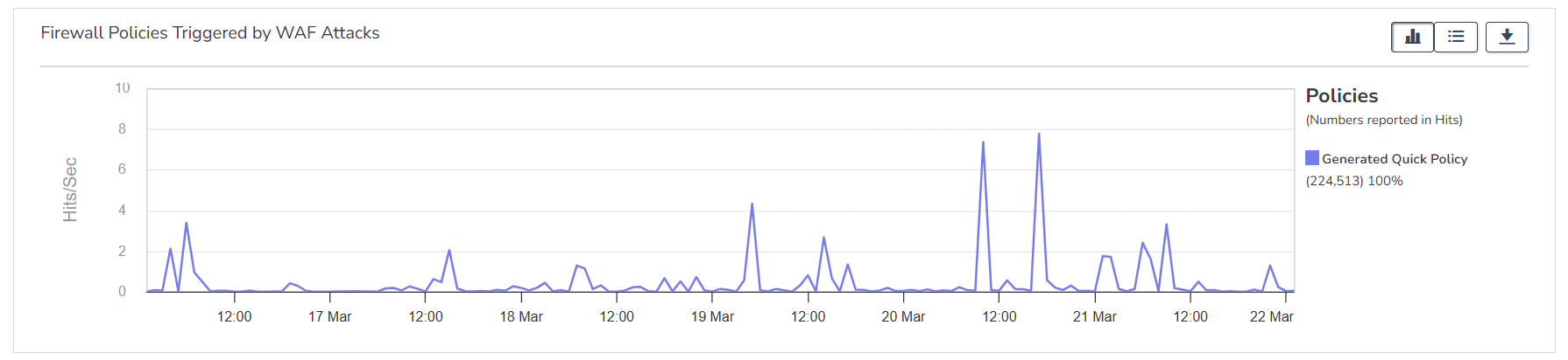 WAF Attackとして検知されたトラフィックについて、どのセキュリティポリシーで検知されているか確認できます。