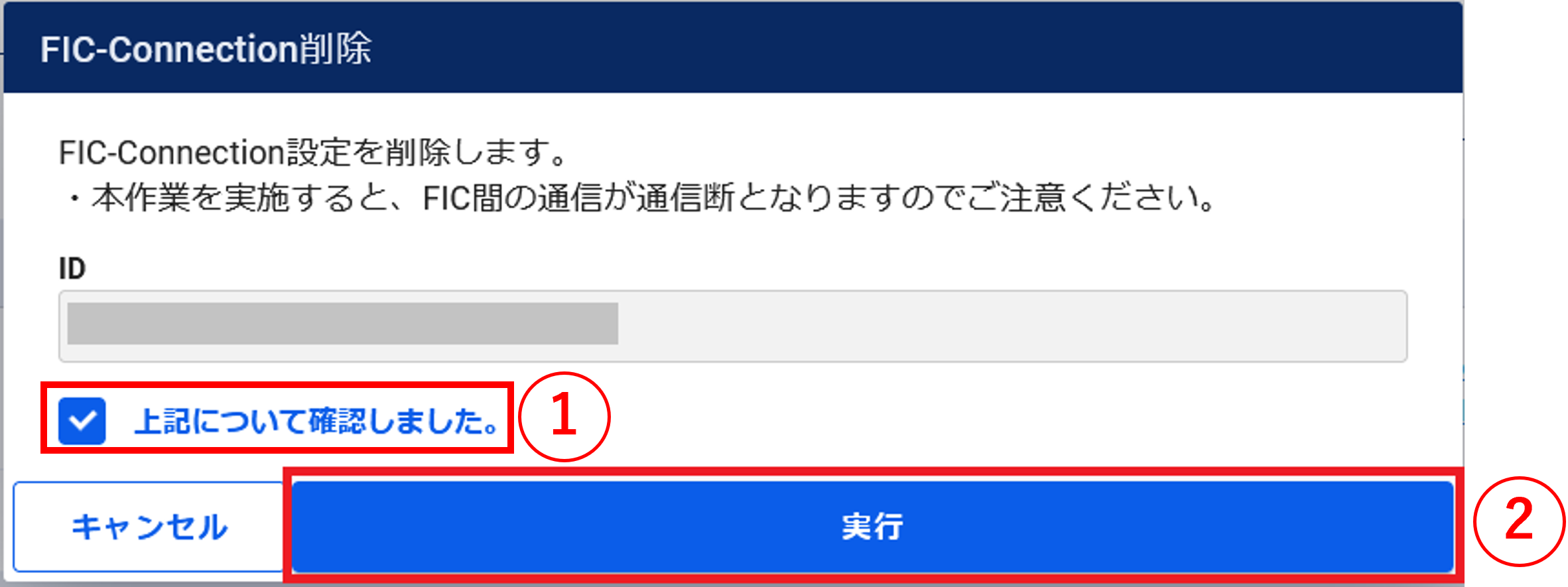 - ➀内容を確認し、[上記について確認しました。]にチェックを入れます。➁ [実行]ボタンを押下します。