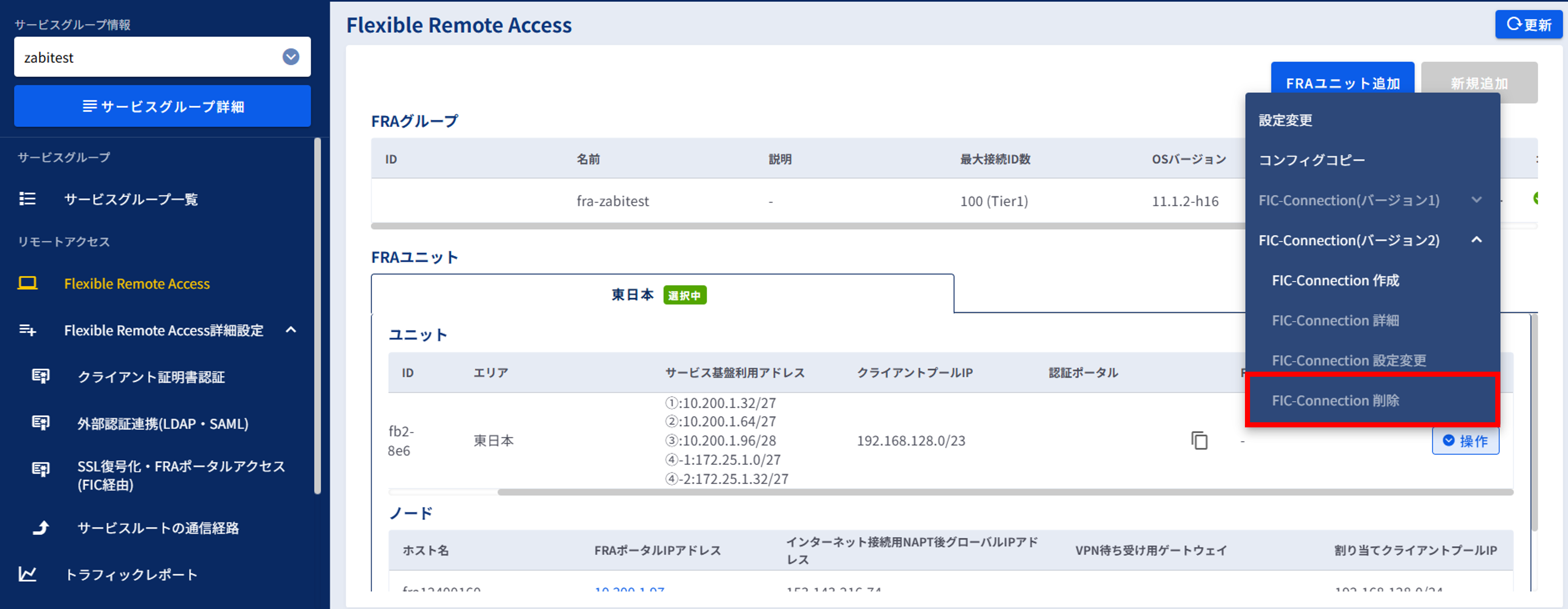 「FRAユニット」画面で削除するFIC-Connectionの[操作]プルダウンメニューより、[FIC-Connection削除]をクリックします。