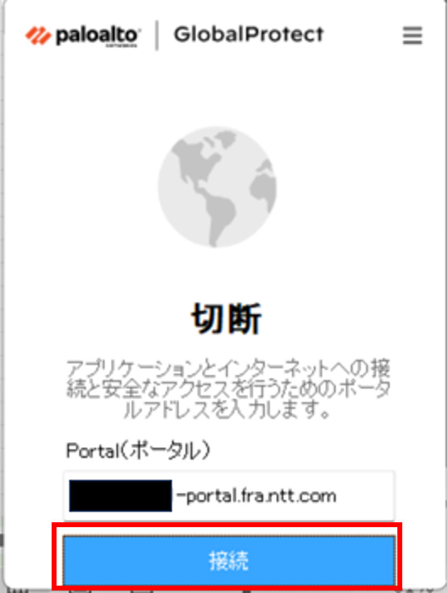 ホーム画面上の[Global Protectアプリ]をクリックします。認証ポータルのアドレス(example-portal.fra.ntt.com)がポータルのアドレスに入力されている事を確認し[接続]ボタンを押下します。