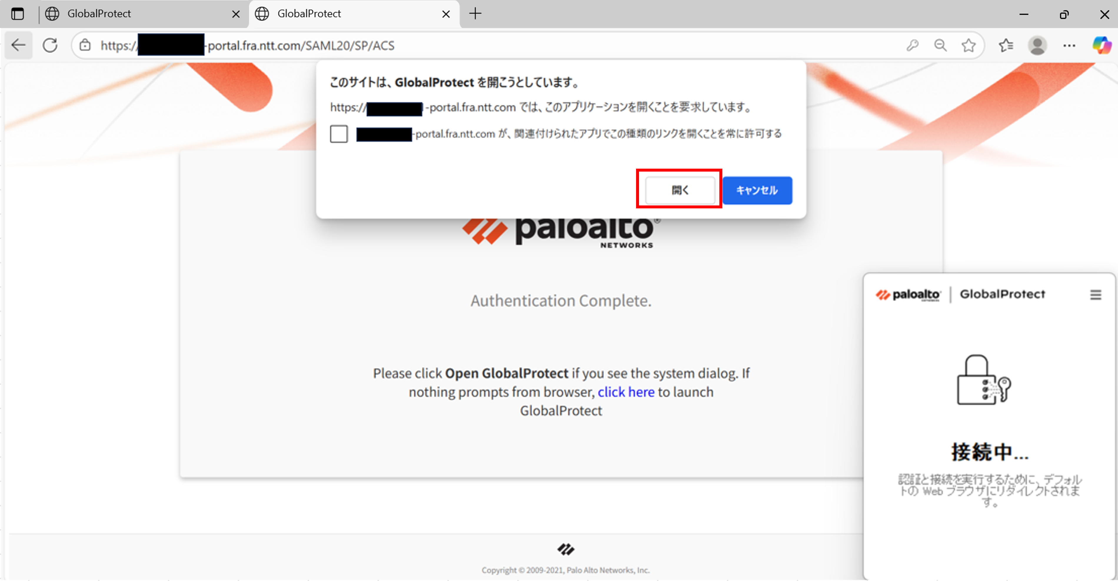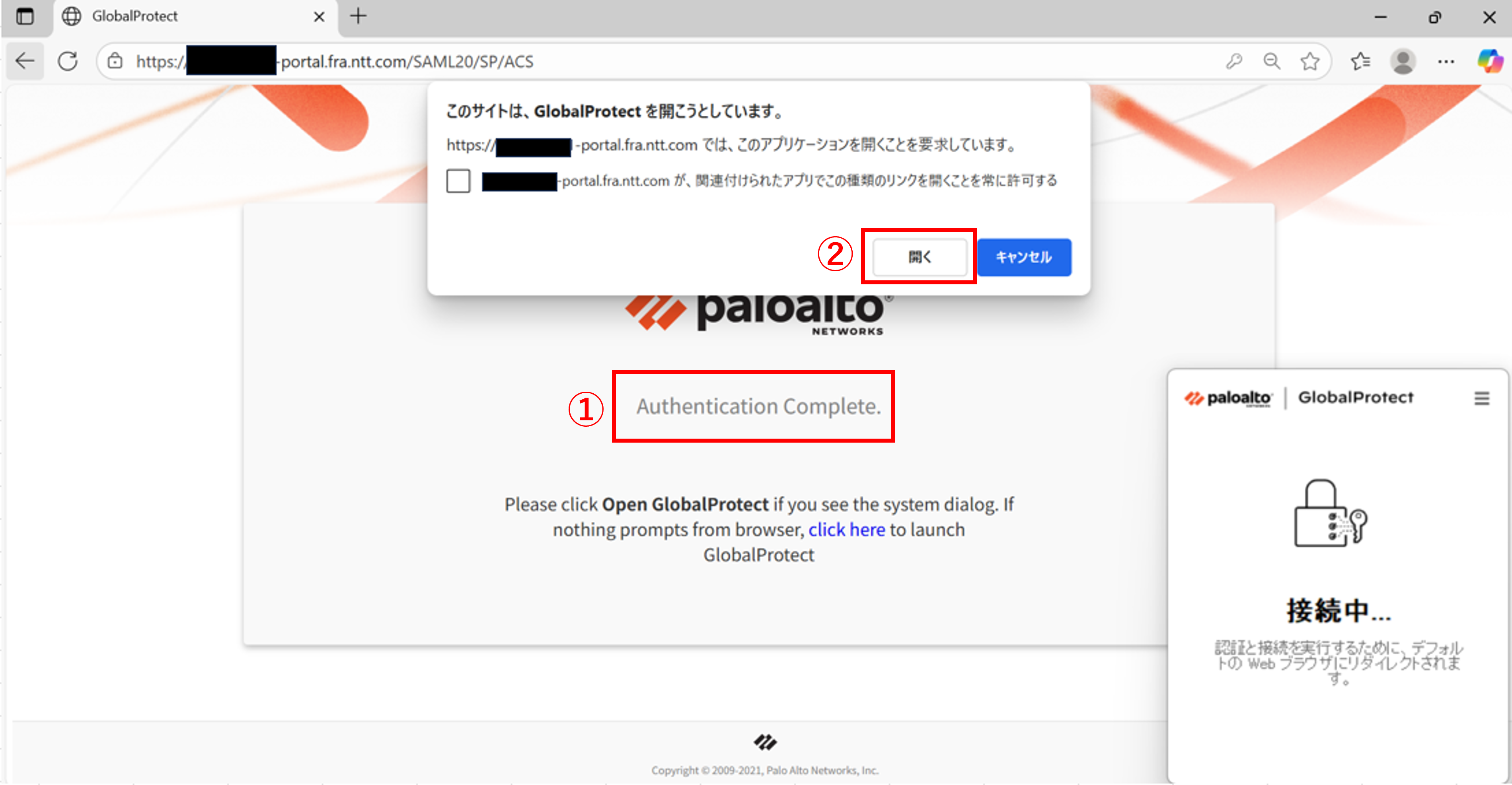 - ①サインインが完了すると認証ポータル画面が表示されるので、画面上に「Authentication Complete」が表示されていることを確認します。②ポップアップ画面の[開く]ボタンを押下します。