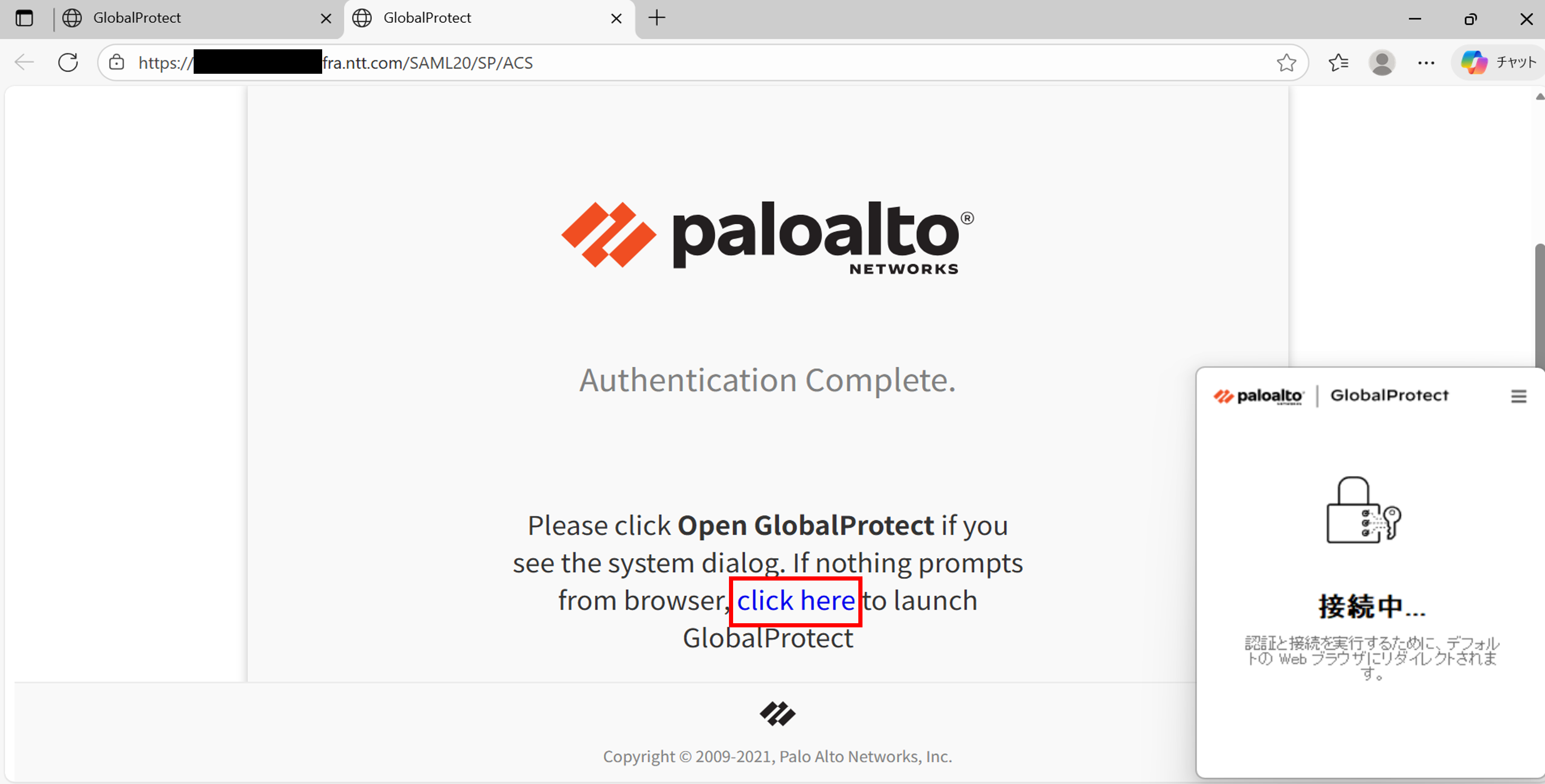 再度認証ポータル画面が表示されるので、画面内の[Click here]をクリックします。
