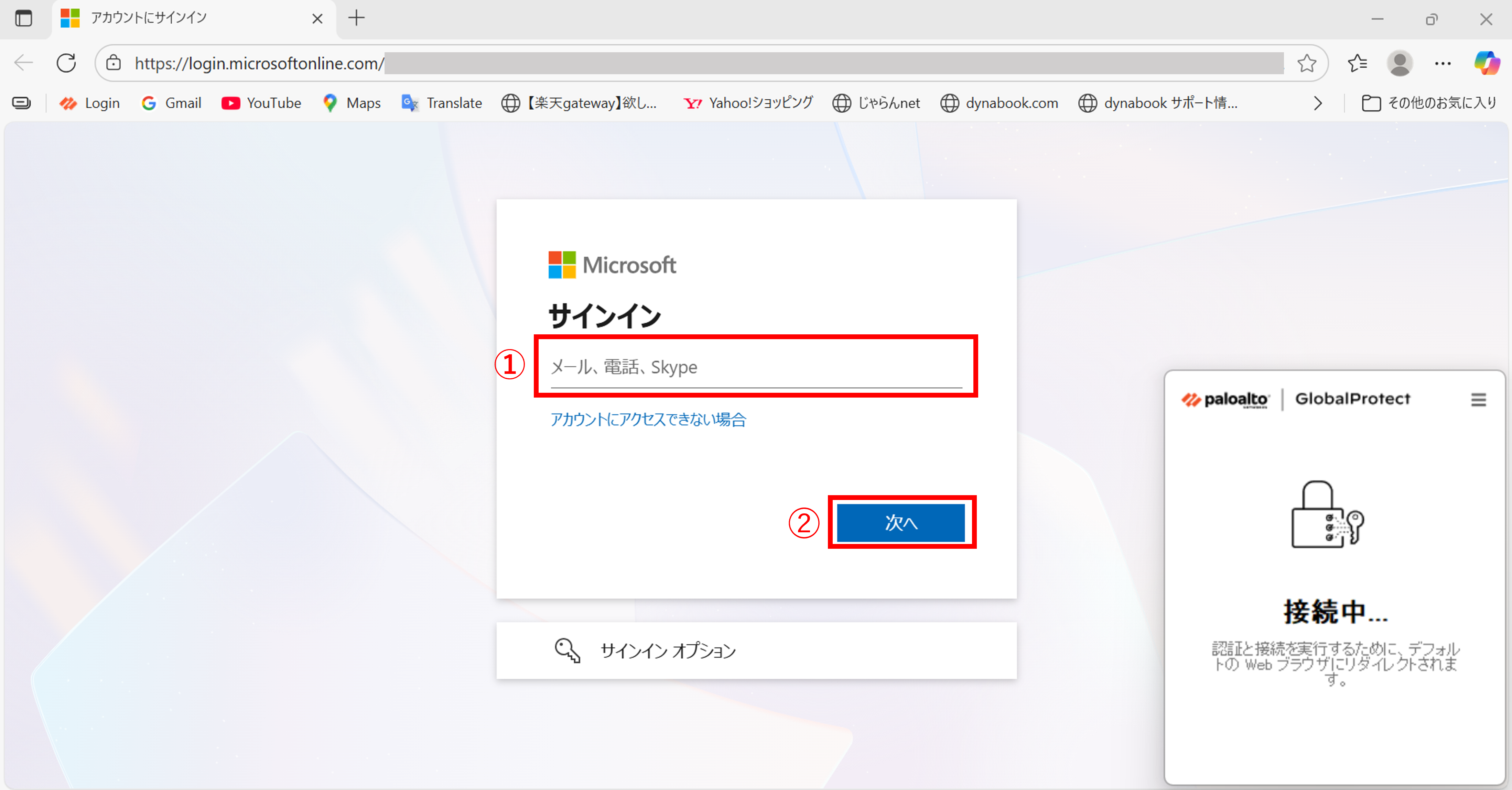 - ①認証画面が表示されるのでユーザIDを入力します。②[次へ]ボタンを押下します。