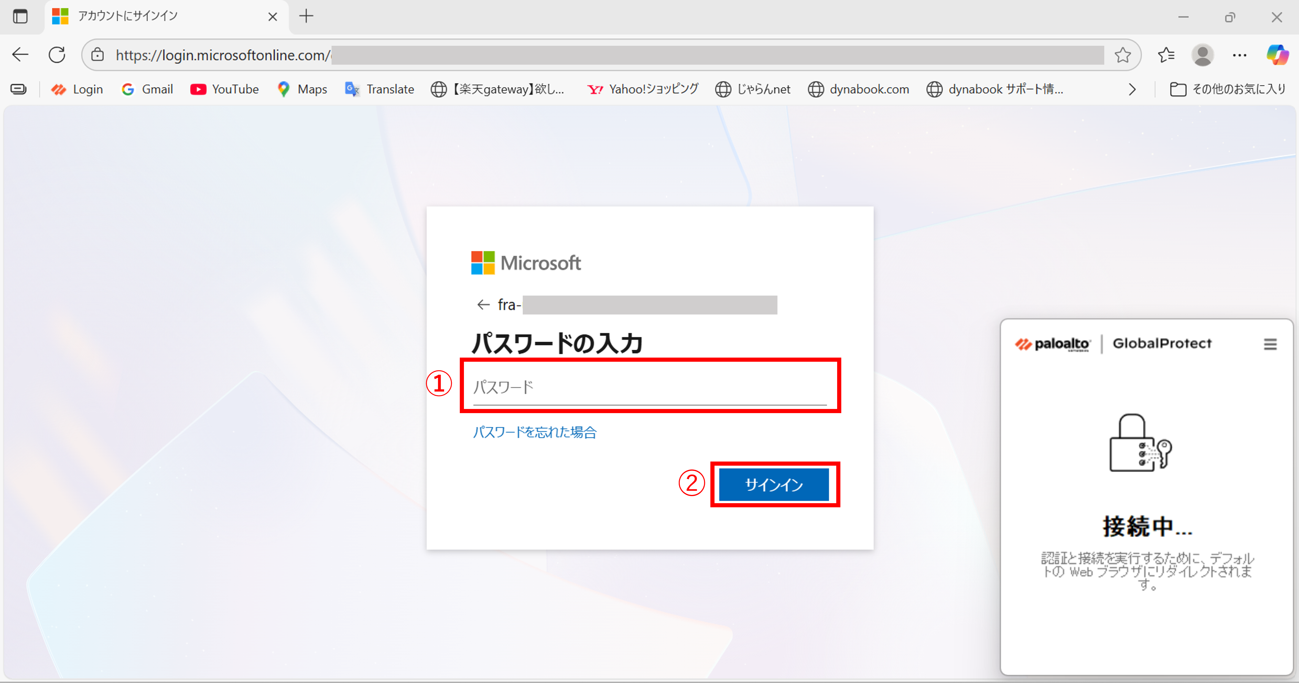 - ①パスワードを入力します。②[サインイン]ボタンを押下します。