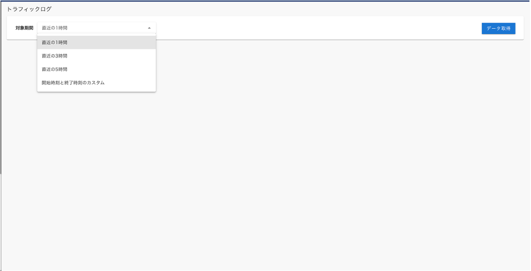 - 下記の通り、[対象期間選択]が表示されます。対象期間は"直近の1時間","直近の3時間","直近の5時間","開始時刻と終了時刻のカスタム"の4つから選択できます。"開始時刻と終了時刻のカスタム"は最大1ヶ月前まで検索可能で範囲は最大9時間になります。