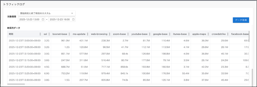 取得期間におけるログデータ量を表示