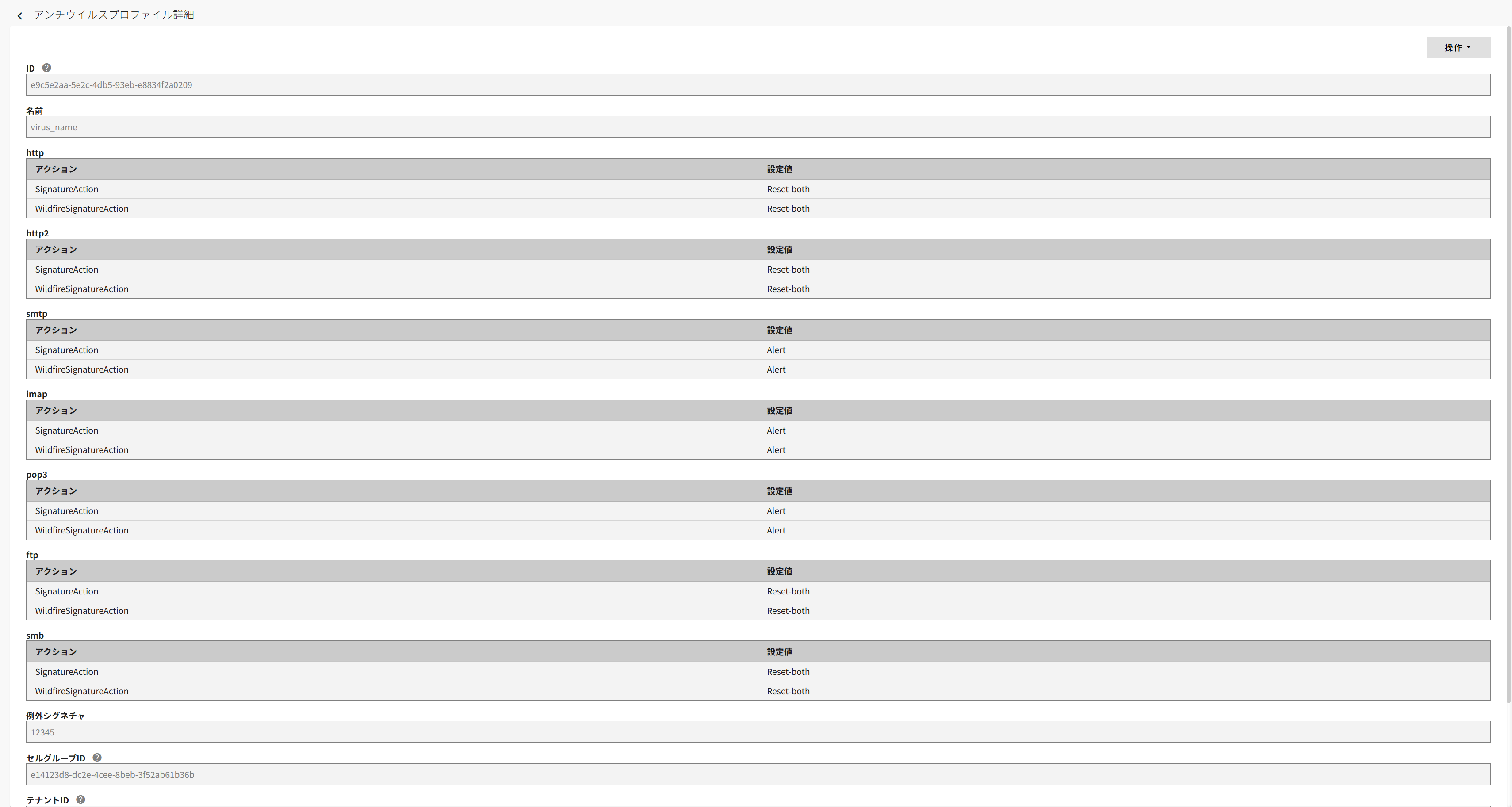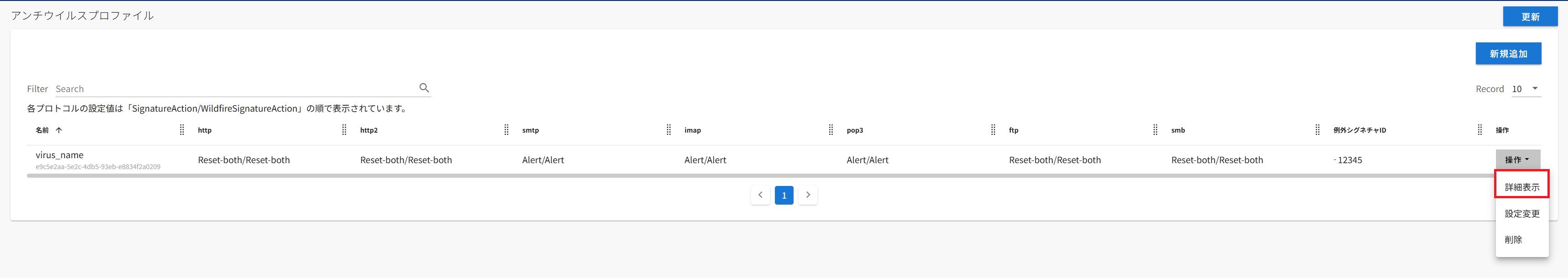 詳細を確認したいアンチウイルスプロファイルの[操作]→[詳細表示]を押下します。