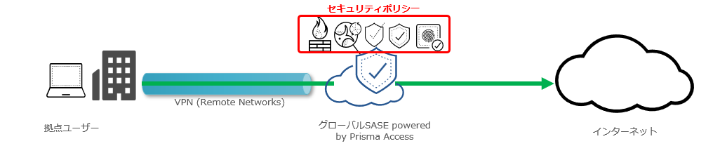 ・セキュリティポリシー設定を行うことで、拠点のユーザーは グローバルSASE powered by Prisma Accessを経由してインターネット等を含む外部へのアクセスができます。