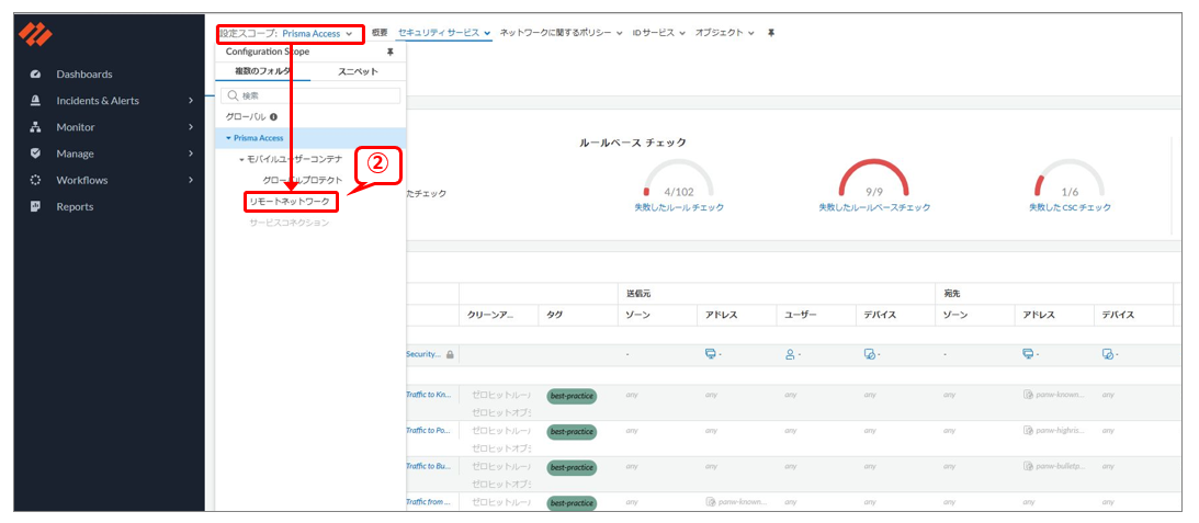 ②設定スコープのプルダウンから、[リモートネットワーク]をクリックします。