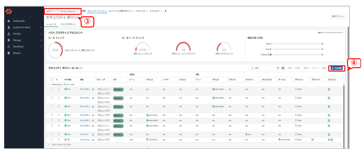 ① Manage > Configuration >NGFWとPrisma Access> セキュリティサービス > [セキュリティポリシー]の順にクリックします。