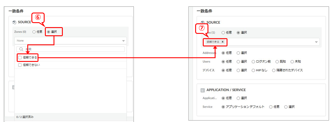 ⑥ SOURCE(送信元)のZonesで[選択]をクリックします。