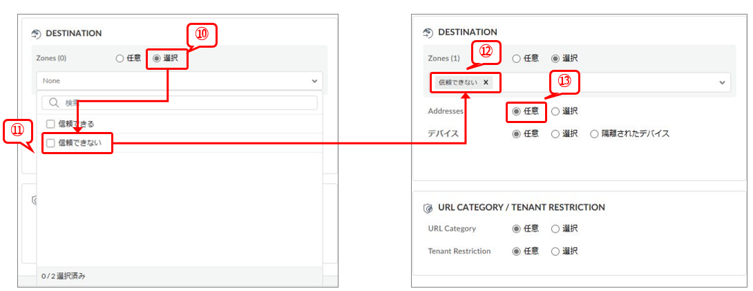 ⑩ DESTINATION(送信先)のZonesで[選択]をクリックします。