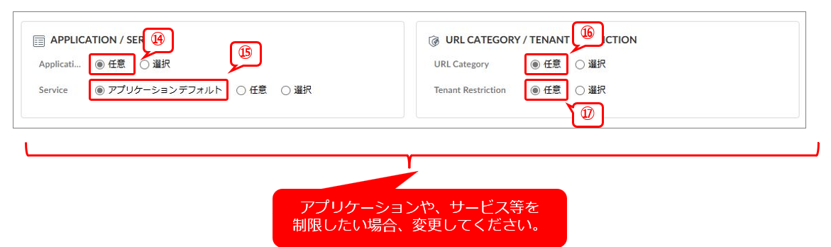 ⑭ Applicationに[任意]が選択されていることを確認します。