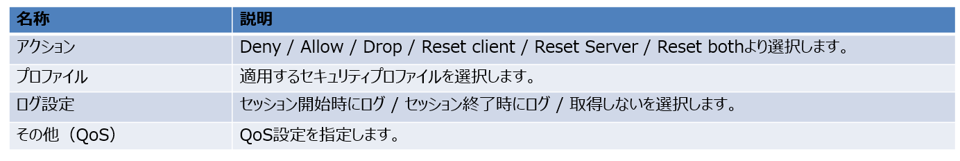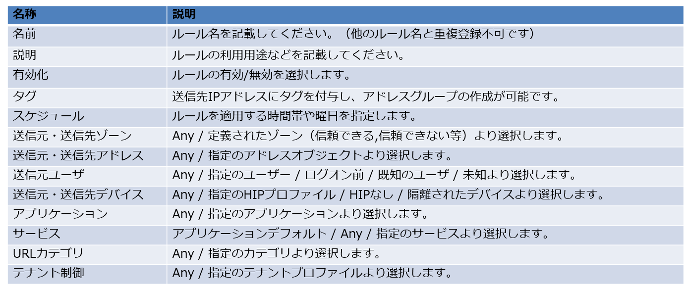・各ルールは、送信元ゾーン、送信元 IP アドレス、送信元ユーザー、HIPプロファイル、宛先ゾーン、宛先 IPアドレス、アプリケーション、サービス(=tcp/udpポート番号)、URLカテゴリの対象トラフィック条件で通信を指定し、その通信に対してのアクションにて構成されます。