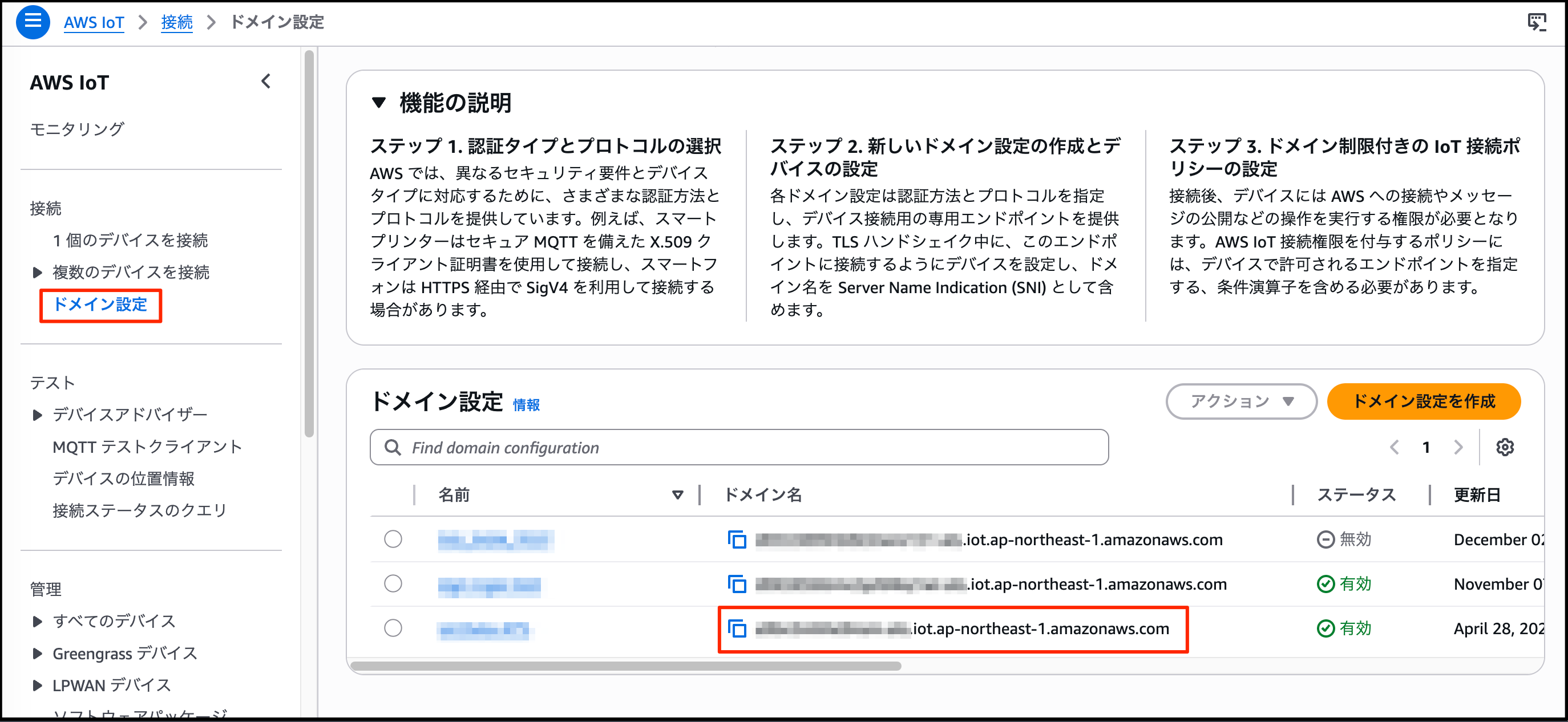 AWS IoT 左ペインの[ドメイン設定] をクリックし、宛先対象のドメイン名をコピーしてご利用ください。
