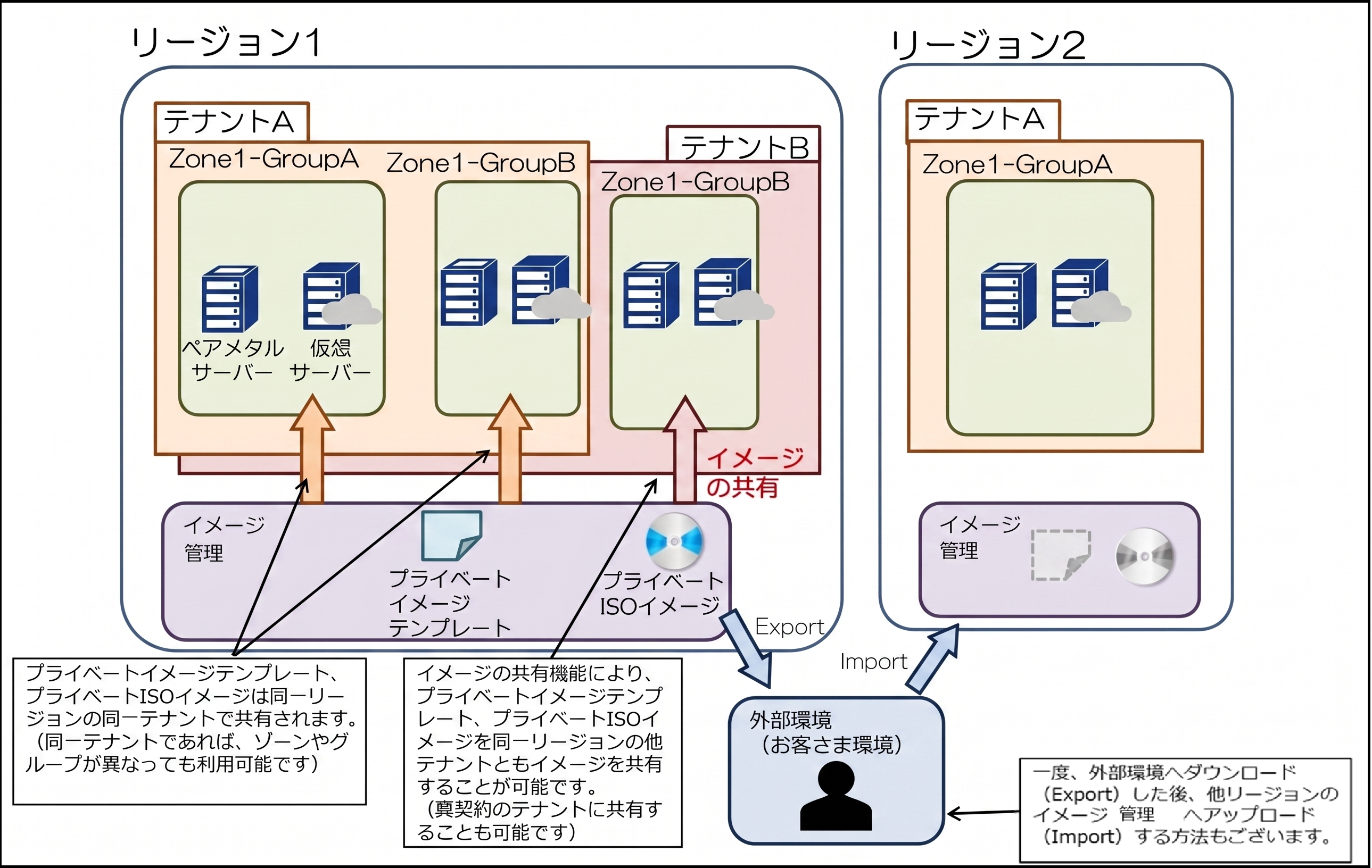 イメージの共有設定により、自身のテナントのイメージ管理で保有しているイメージを他テナントに公開し、共有できます。これにより、特定コミュニティ間(たとえば、パートナー様とエンドユーザー様)で独自イメージを共有できます。