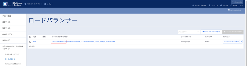 一覧から対象のロードバランサーインスタンスのプランの先頭に「 MIGRATION__NEEDED_ 」の追加名称が付与されていることを確認します。