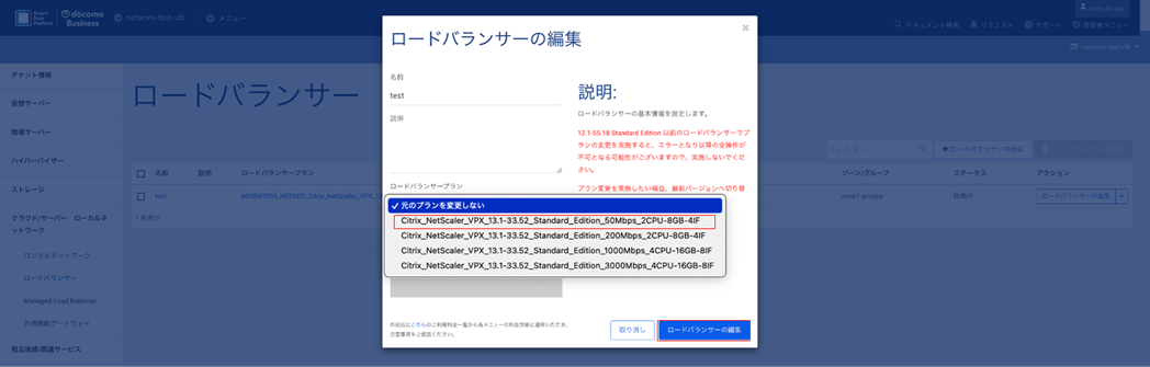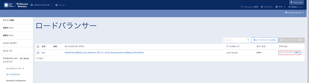 ロードバランサープランから「 MIGRATION_NEEDED_ 」が付与されていないプランを選択し、「ロードバランサーの編集」をクリックします。
