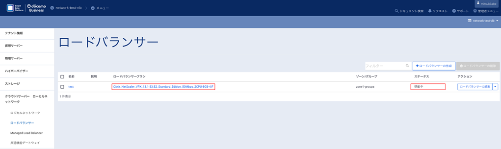 SDPFポータルへログインし、[クラウド/サーバー ローカルネットワーク]>[ロードバランサー]メニューを開きます。