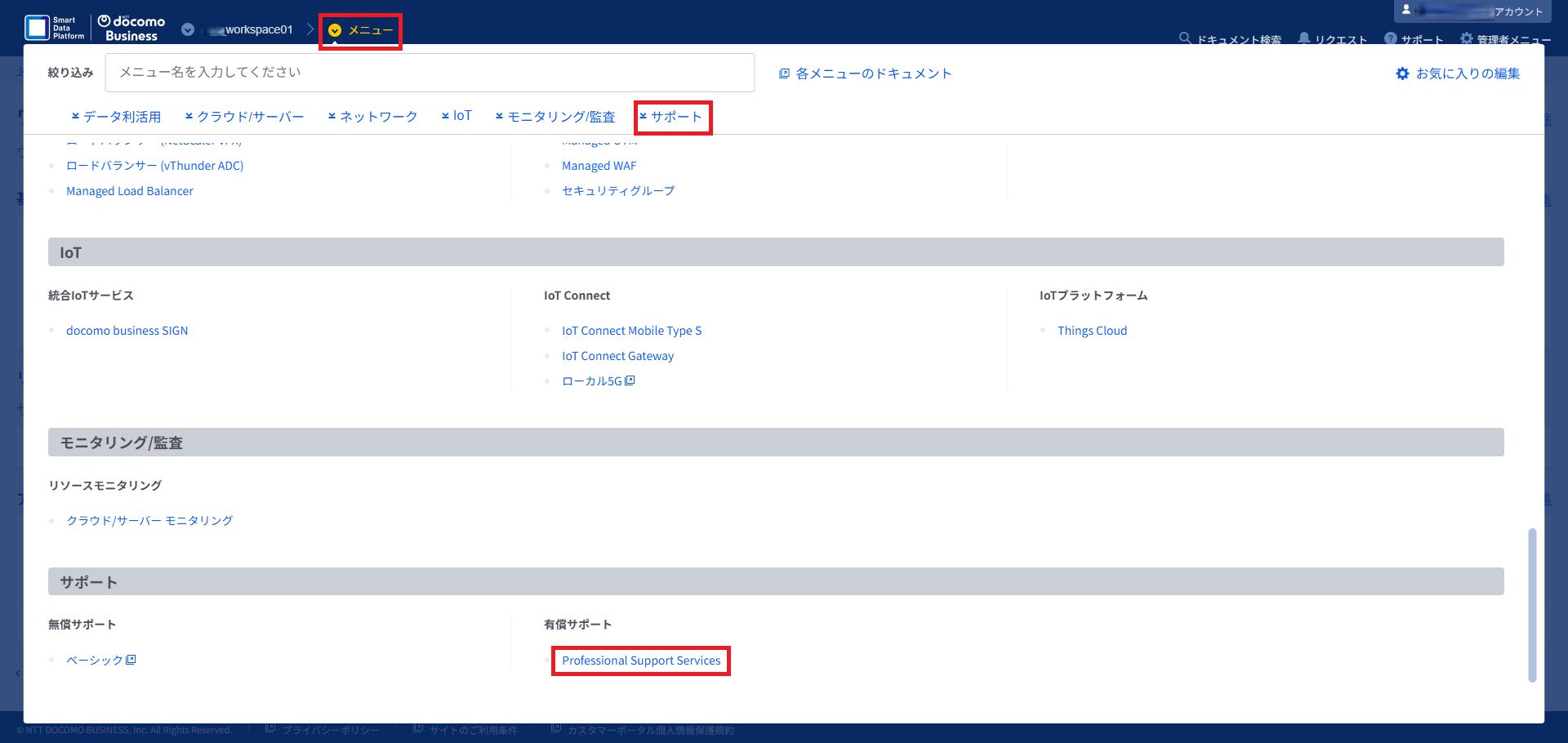 (1) メニューの「サポート」から「Professional Support Services」を選択します。