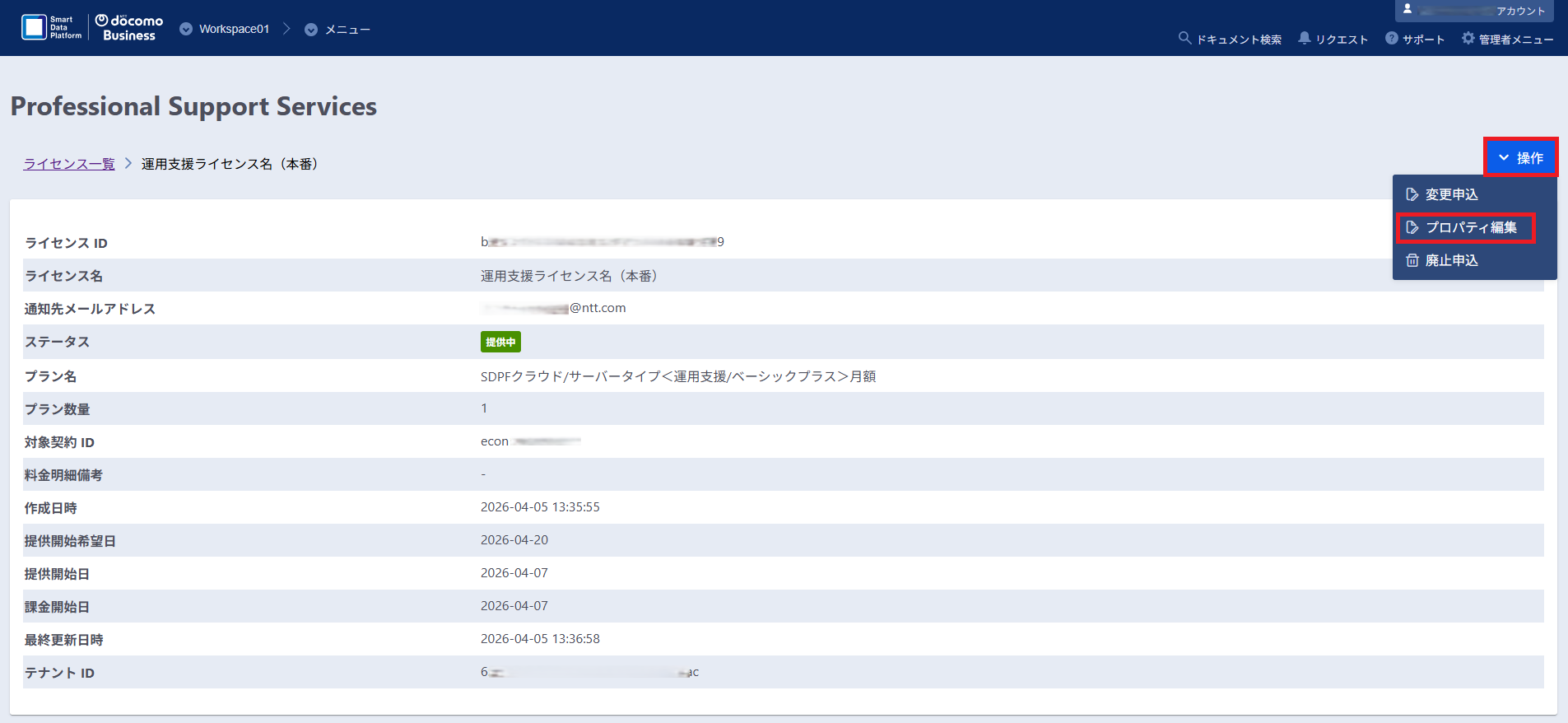 (1) 変更を行うライセンスの「操作」から「プロパティ編集」をクリックしてください。