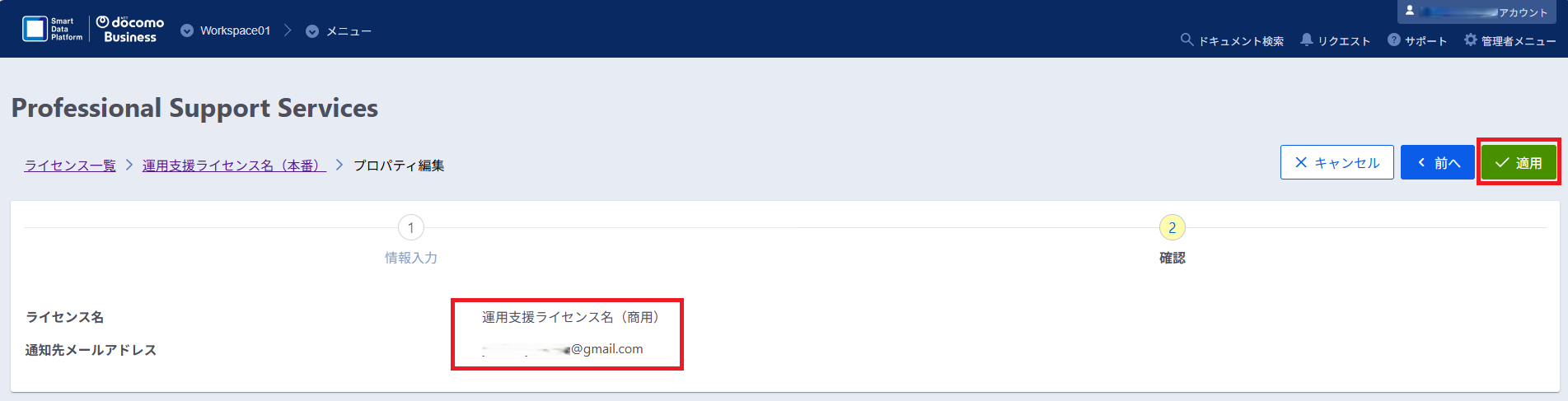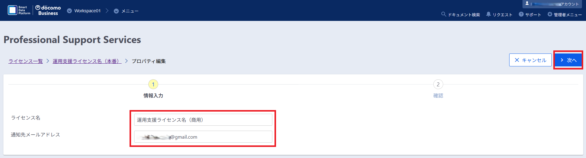 (2)「ライセンス名」「通知先メールアドレス」を編集し、「次へ」をクリックします。