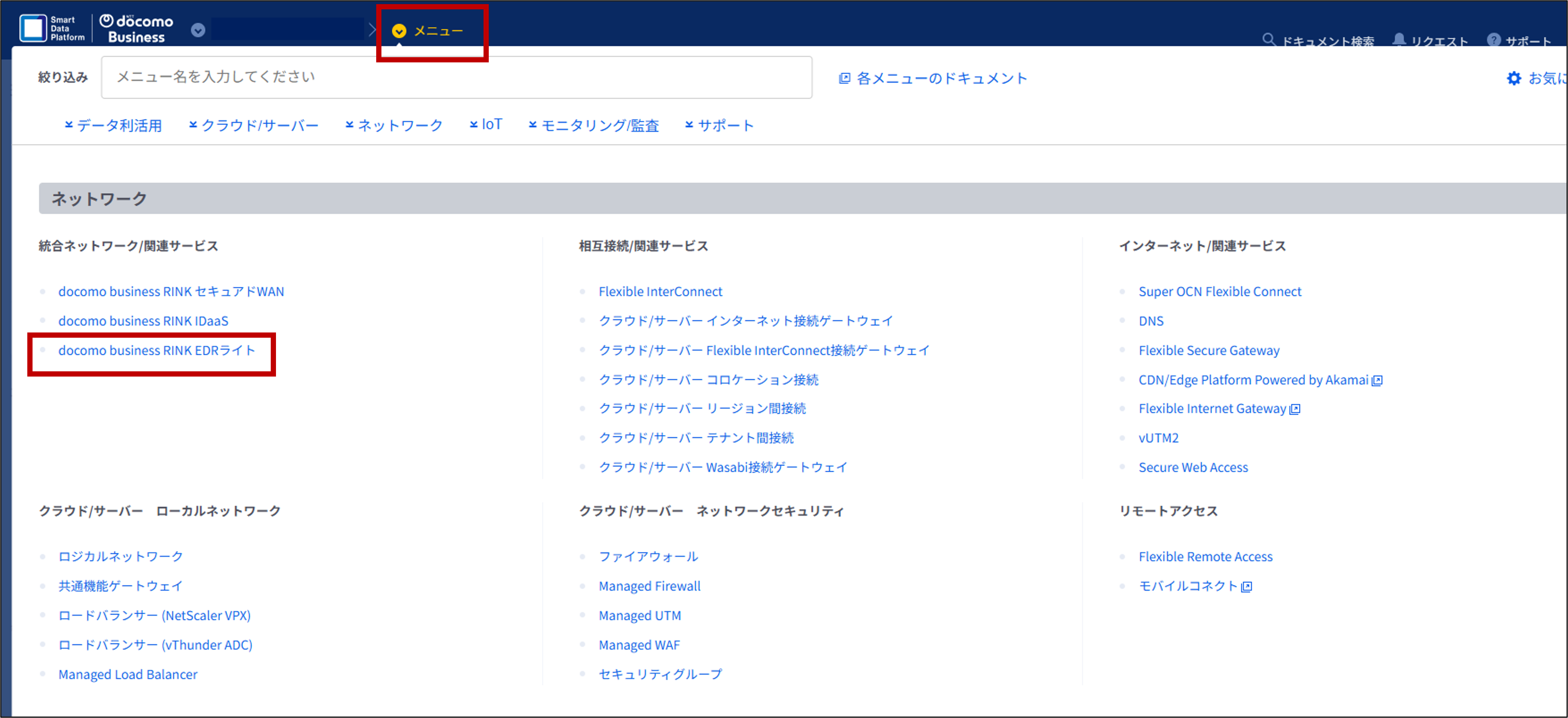 「1.1. Smart Data Platformの準備」で作成いただいたワークスペースのメニュー欄から、「docomo business RINK EDRライト」を選択してRINKポータルへログインの上、