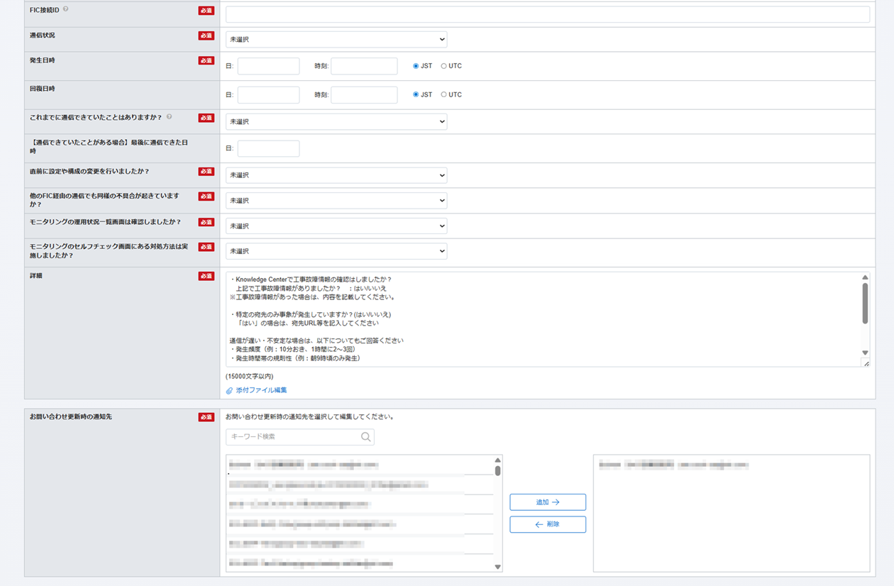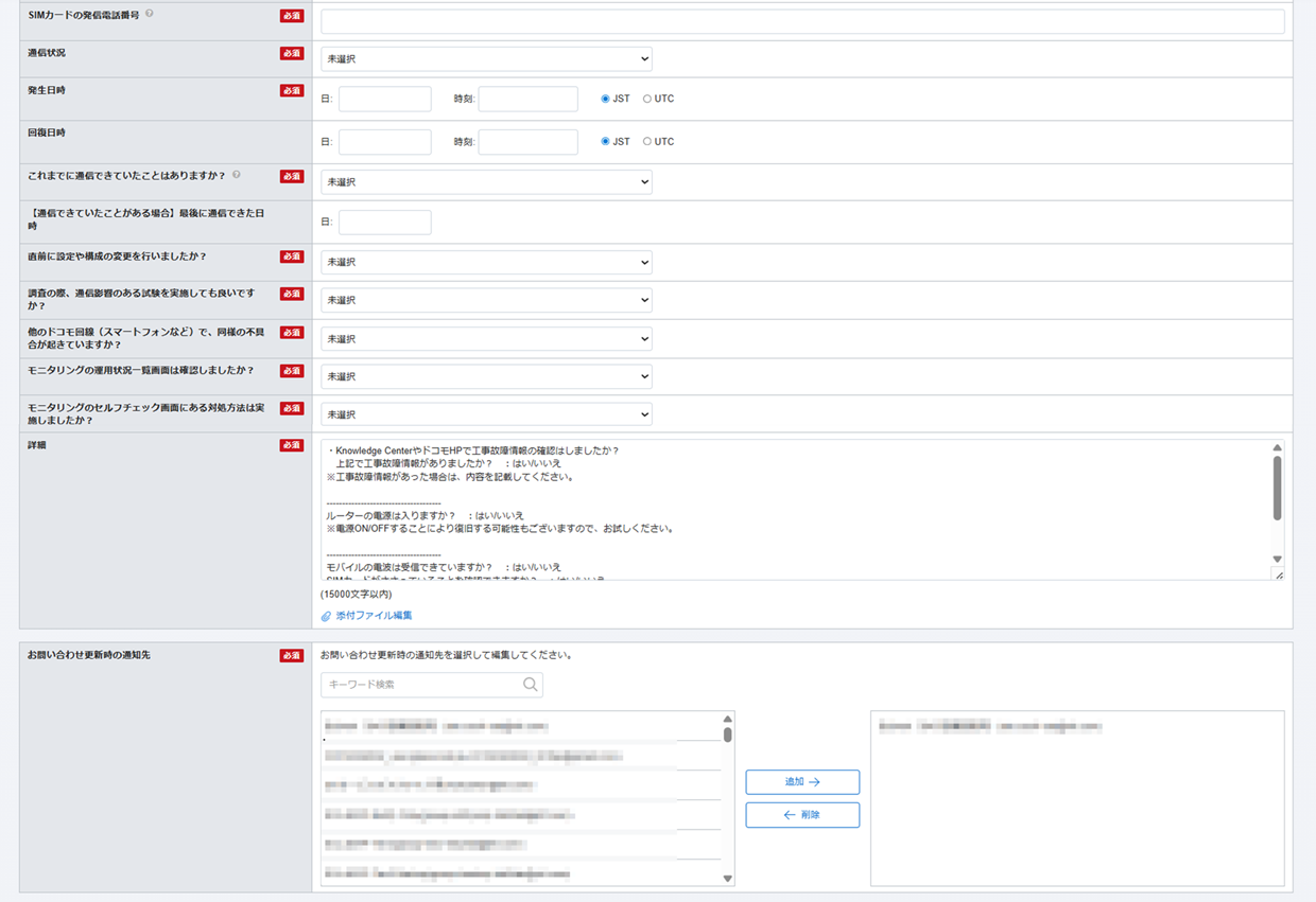 お問い合わせ更新時の通知先を選択し[追加]ボタンを押下します |