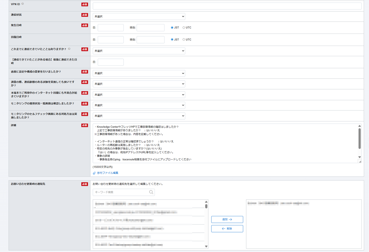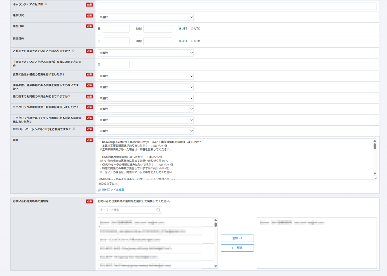 計画工事に関連して、想定外の通信影響や通信不具合が発生している場合はチケット種別「[WAN]通信不具合・故障に関する問合せ」の詳細分類「[故障]ギャランティアクセスの故障の問合せ」からお問合せください。ポータル工事に関してはチケット種別「サービス仕様・利用方法・お申込み内容に関する問合せ」の詳細分類「[問合せ]ポータル・APIに関する問合せ」からお問合せください。