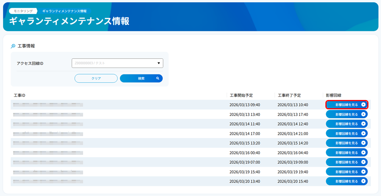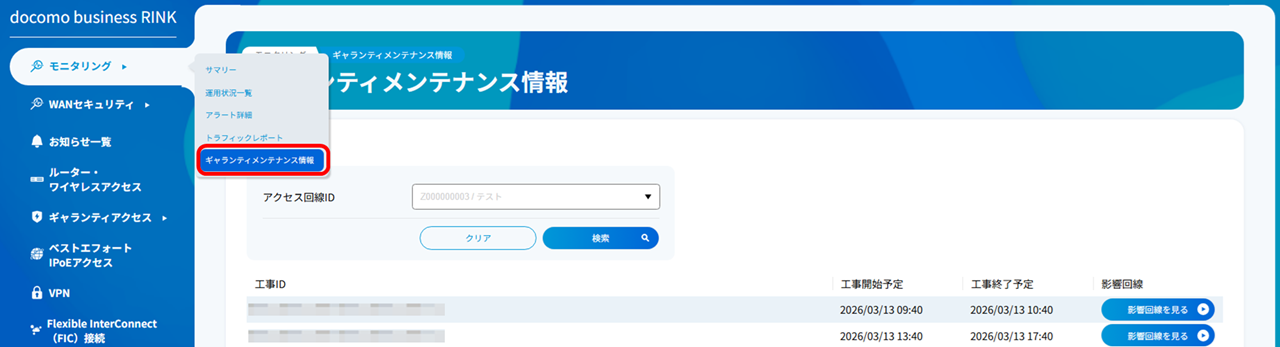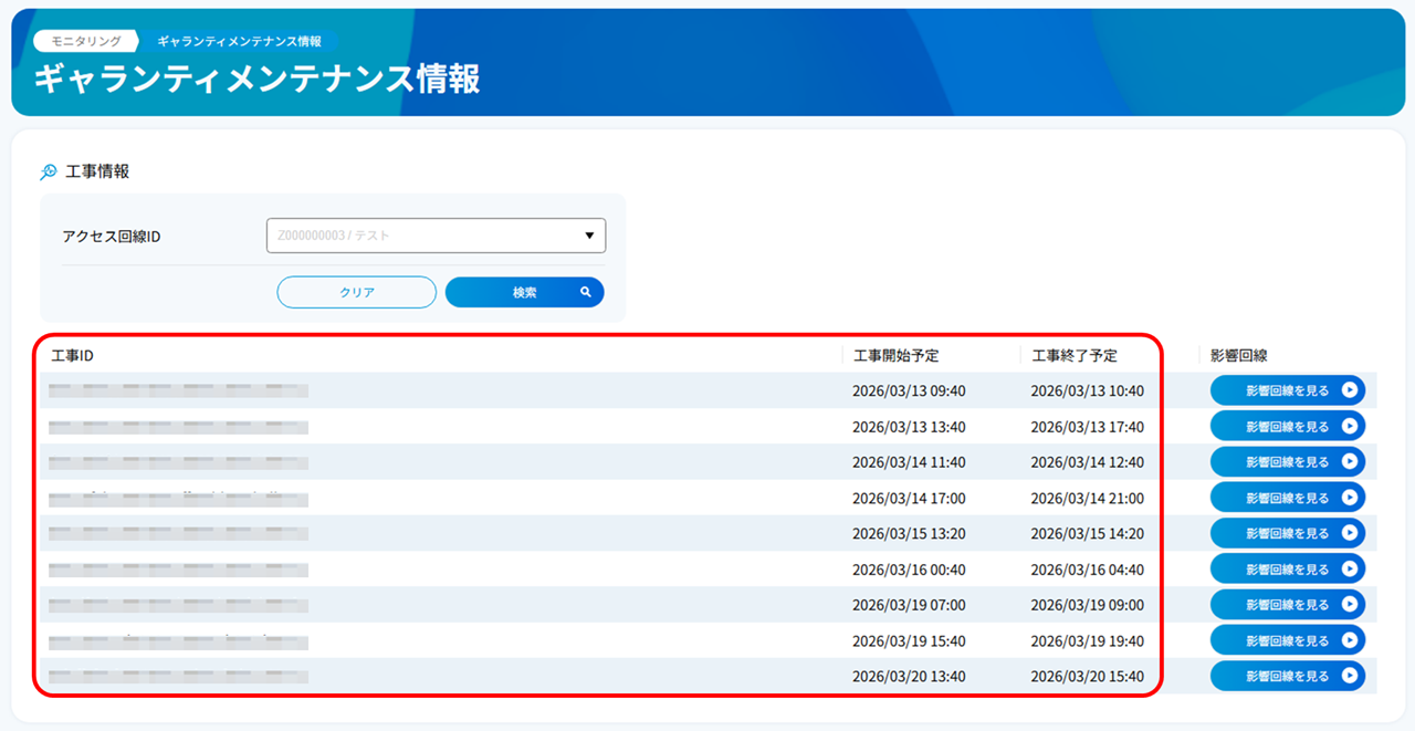 ギャランティアクセスを対象としたメンテナンスが予定されている場合、工事情報を表示します。