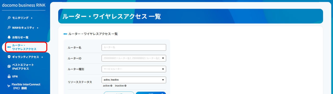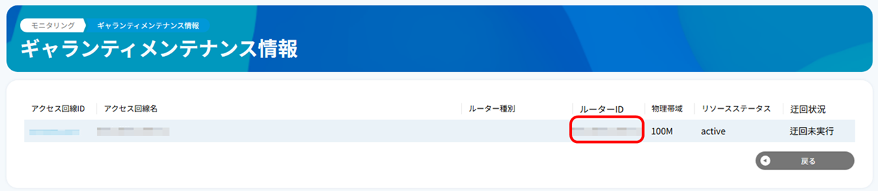 緊急メンテナンスなど、表示されない場合があります。その場合は「ルーター・ワイヤレスアクセス」よりメンテナンス対象回線に接続されるルーターIDを押下し、 手順6. へお進みください。