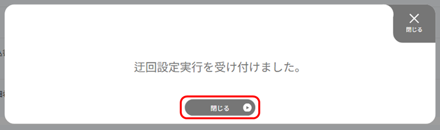 「迂回設定実行を受け付けました。」の画面が表示されますので、[閉じる]ボタンを押下します。