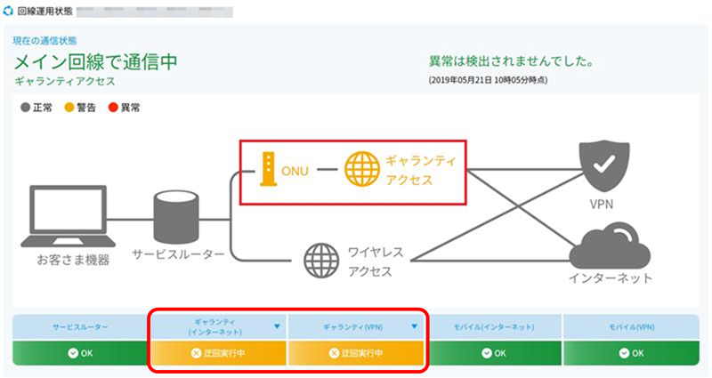 - 設定が完了後、対象のルーターにてセルフチェックを実行し、迂回実行中のステータスであることを確認します。セルフチェックの手順については「セルフチェック機能を活用する」をご参照ください。
