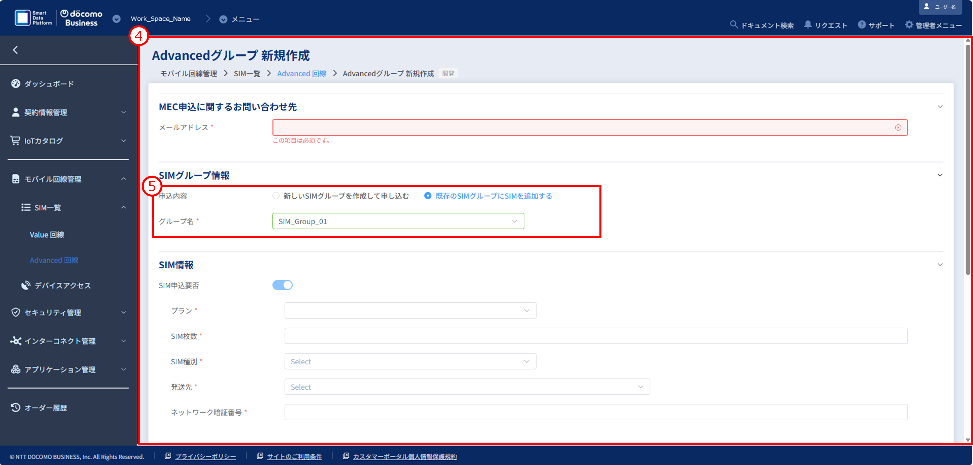 ⑤追加したいSIMグループの変更が可能です。また新規でSIMグループ作成を選択した場合、そのSIMグループに回線が登録されます。