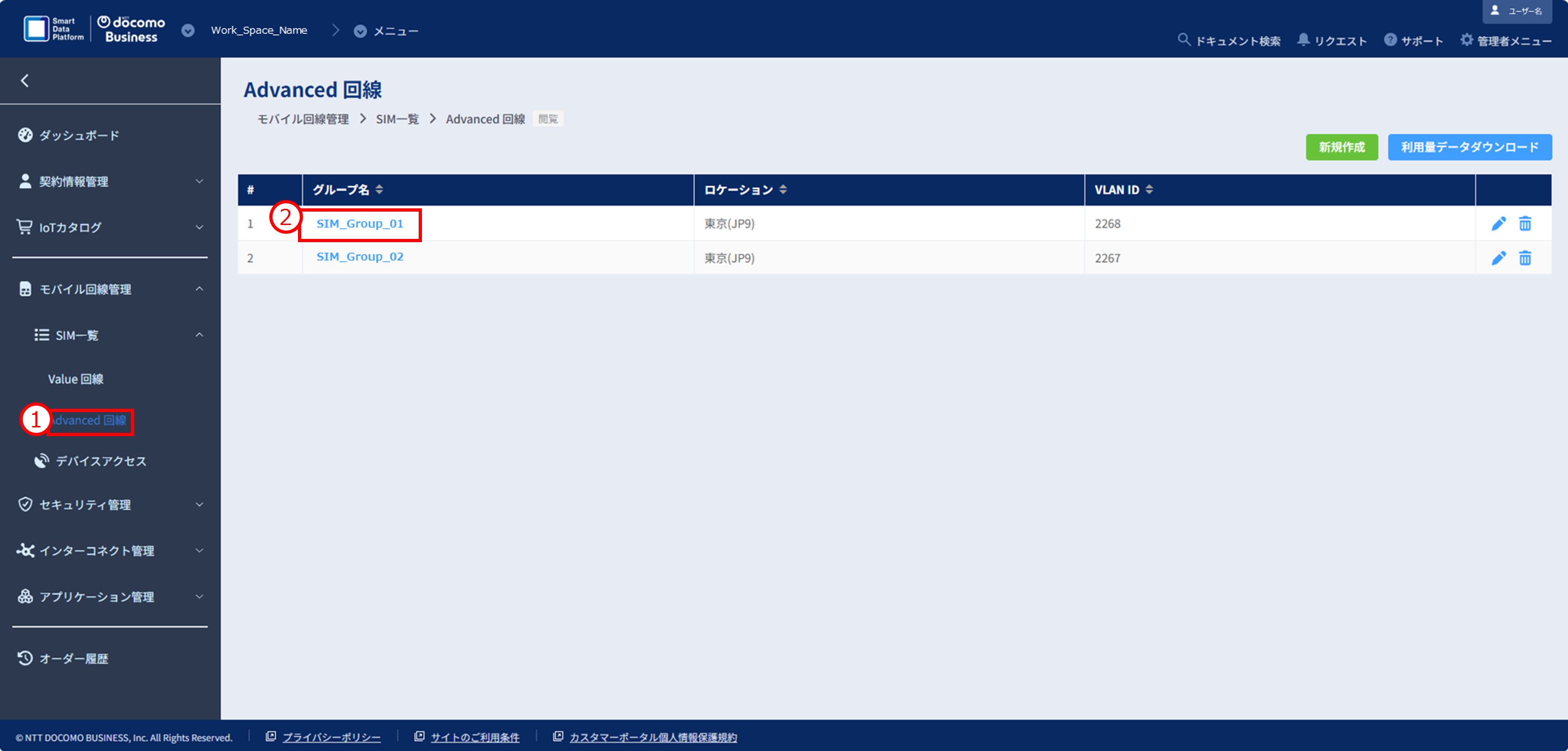 ①モバイル回線管理>SIM一覧>「Advanced回線」をクリックし、SIMグループ一覧画面を開きます。