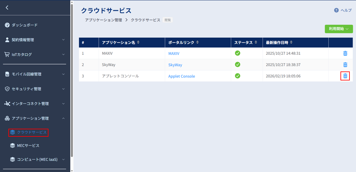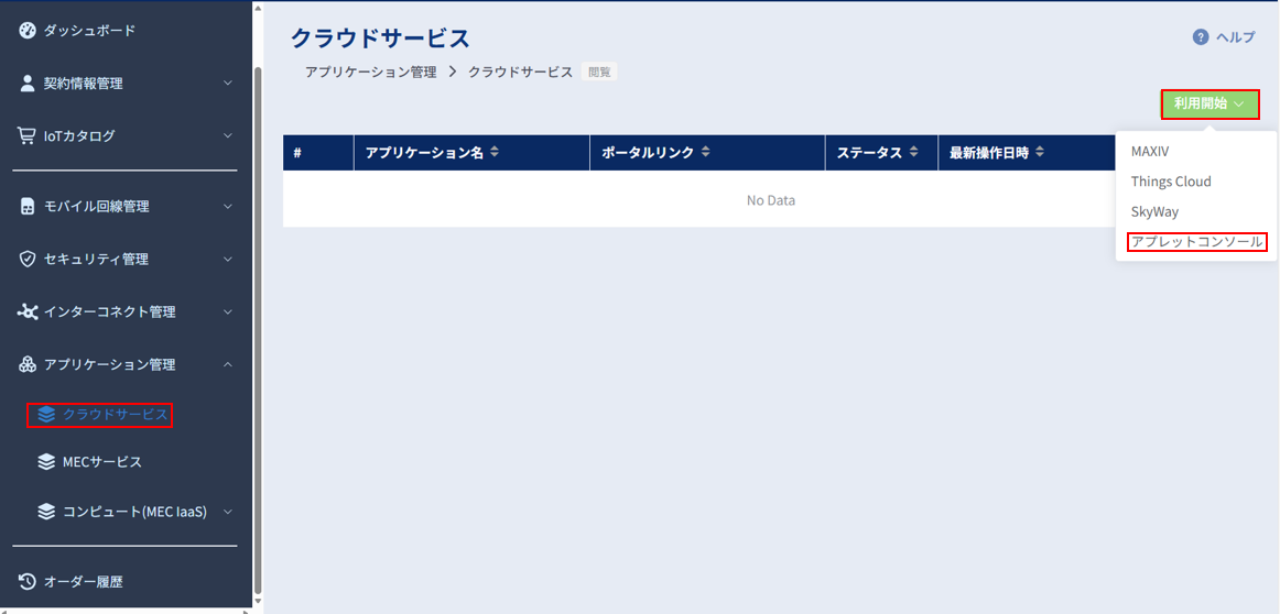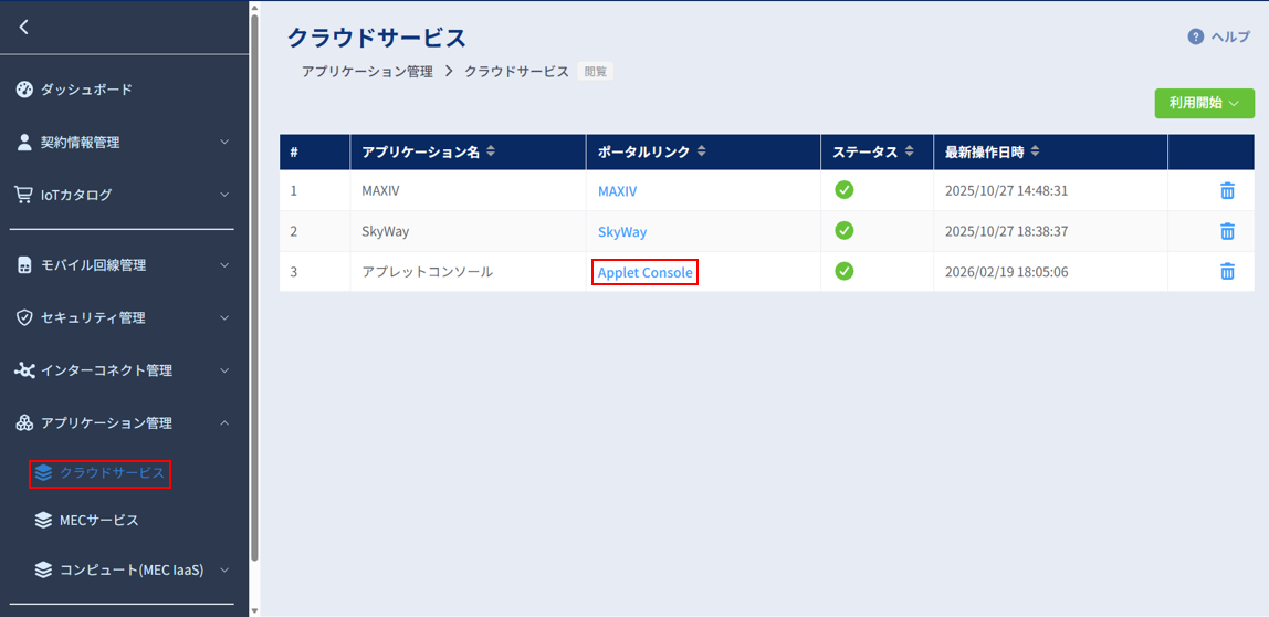 左のメニューの[アプリケーション管理]から[クラウドサービス]を選択します。 クラウドサービスの一覧が表示されますので、画面右上の[利用開始]ボタンより[アプレットコンソール]を押下してください。