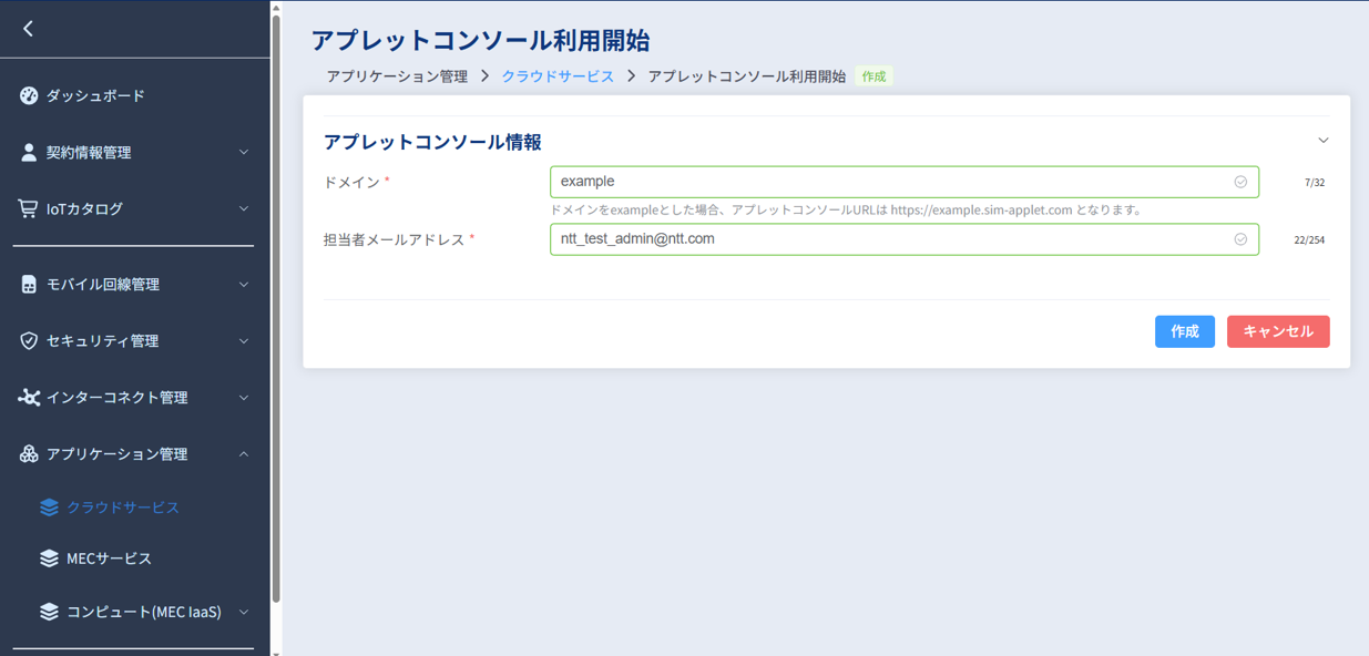 アプレットコンソールのURLの一部として利用されるドメイン名を入力します。 |