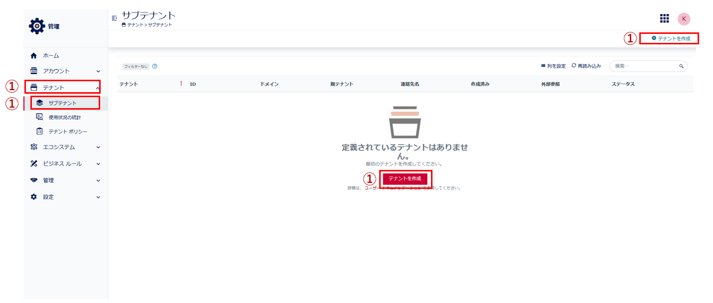 画面右上のアプリケーションスイッチャ>「管理」を押下し、管理画面に移動します。そして、ナビメニューから「テナント」>「サブテナント」を押下します。次に画面中央(初回のみ)、またはトップメニューバー右にある「テナントを作成」ボタンを押下します。